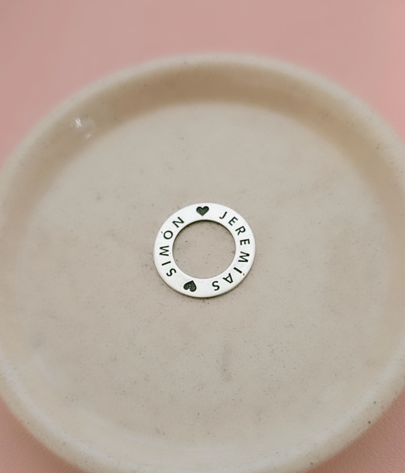 Arandela de Plata 925 con grabado personalizado de nombres, iniciales o palabras especiales. Su diseño circular la convierte en una pieza única, ideal para llevar siempre cerca a quienes más querés.