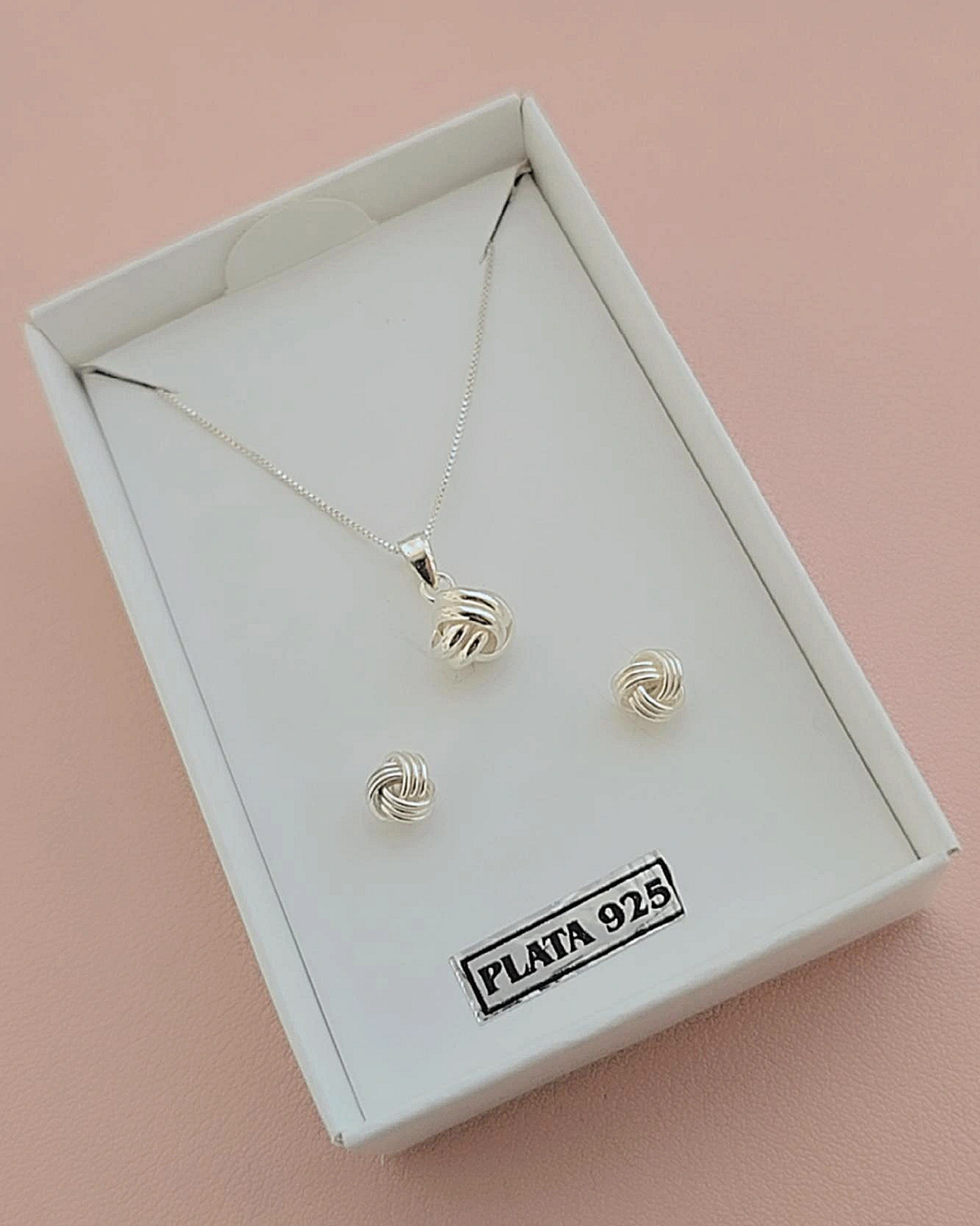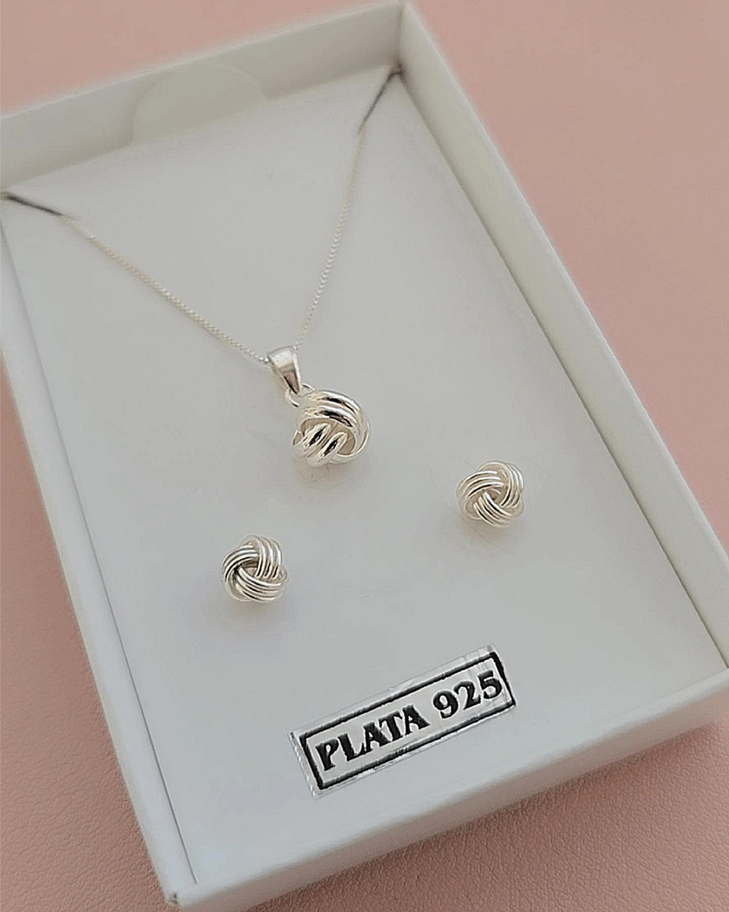 Set de collar y aros en Plata 925 con diseño de nudo. Un clásico elegante que nunca pasa de moda.
