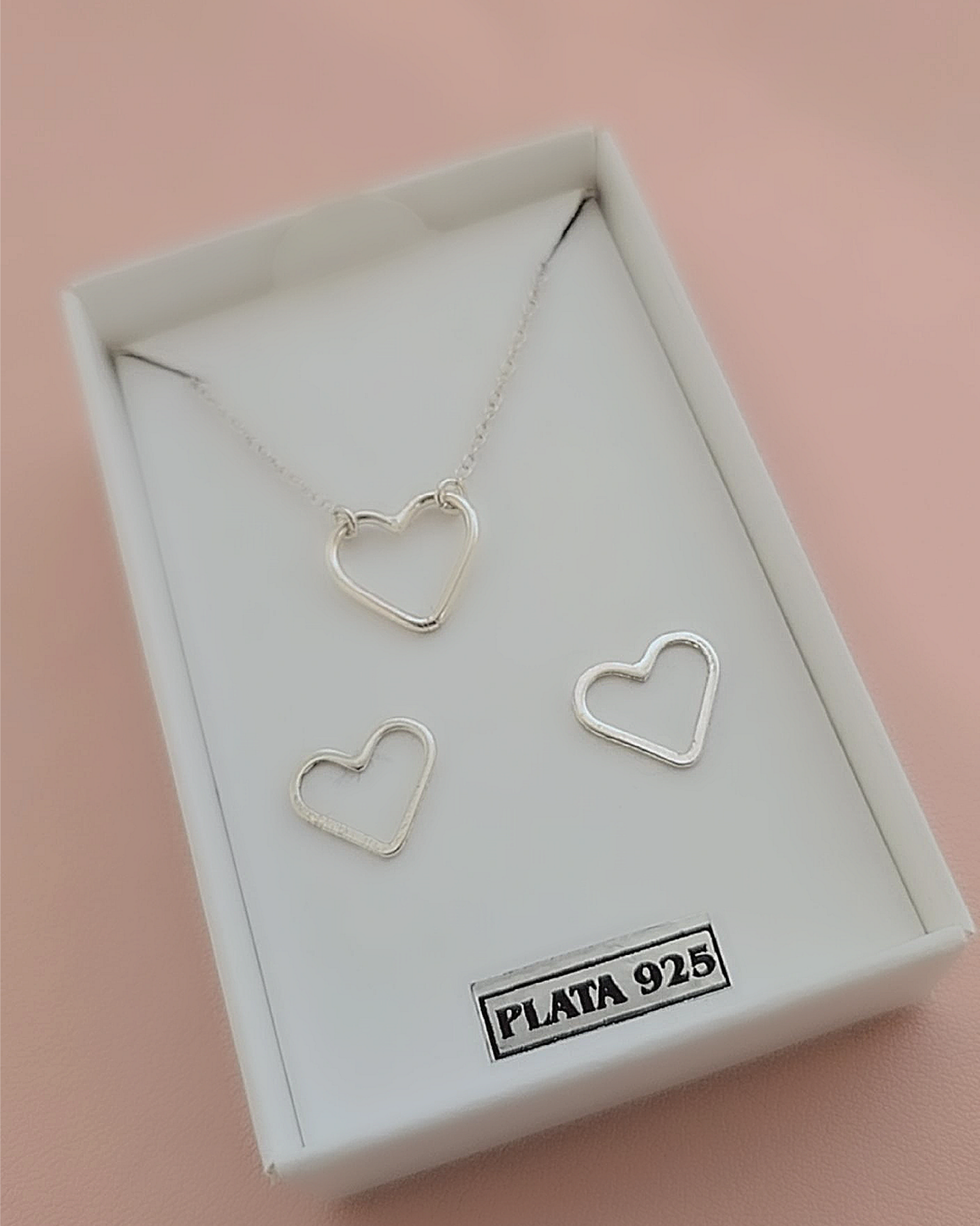 Set de collar y aros en Plata 925 con diseño de corazones calados simples. Minimalista y delicado, perfecto para el uso diario.