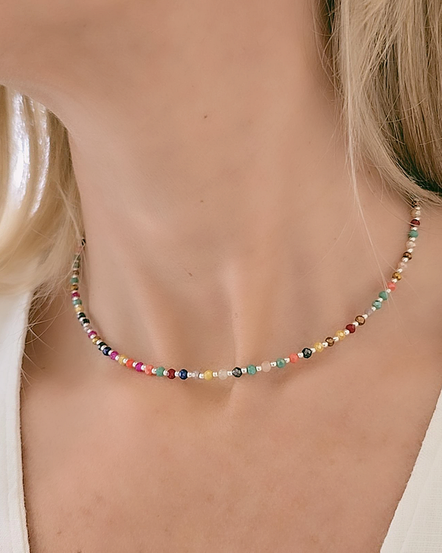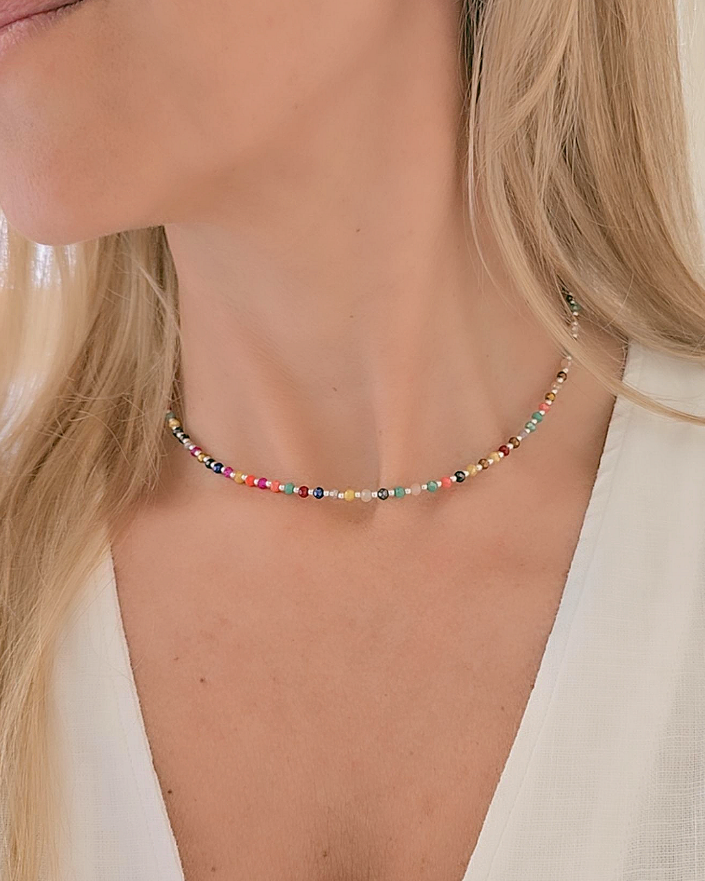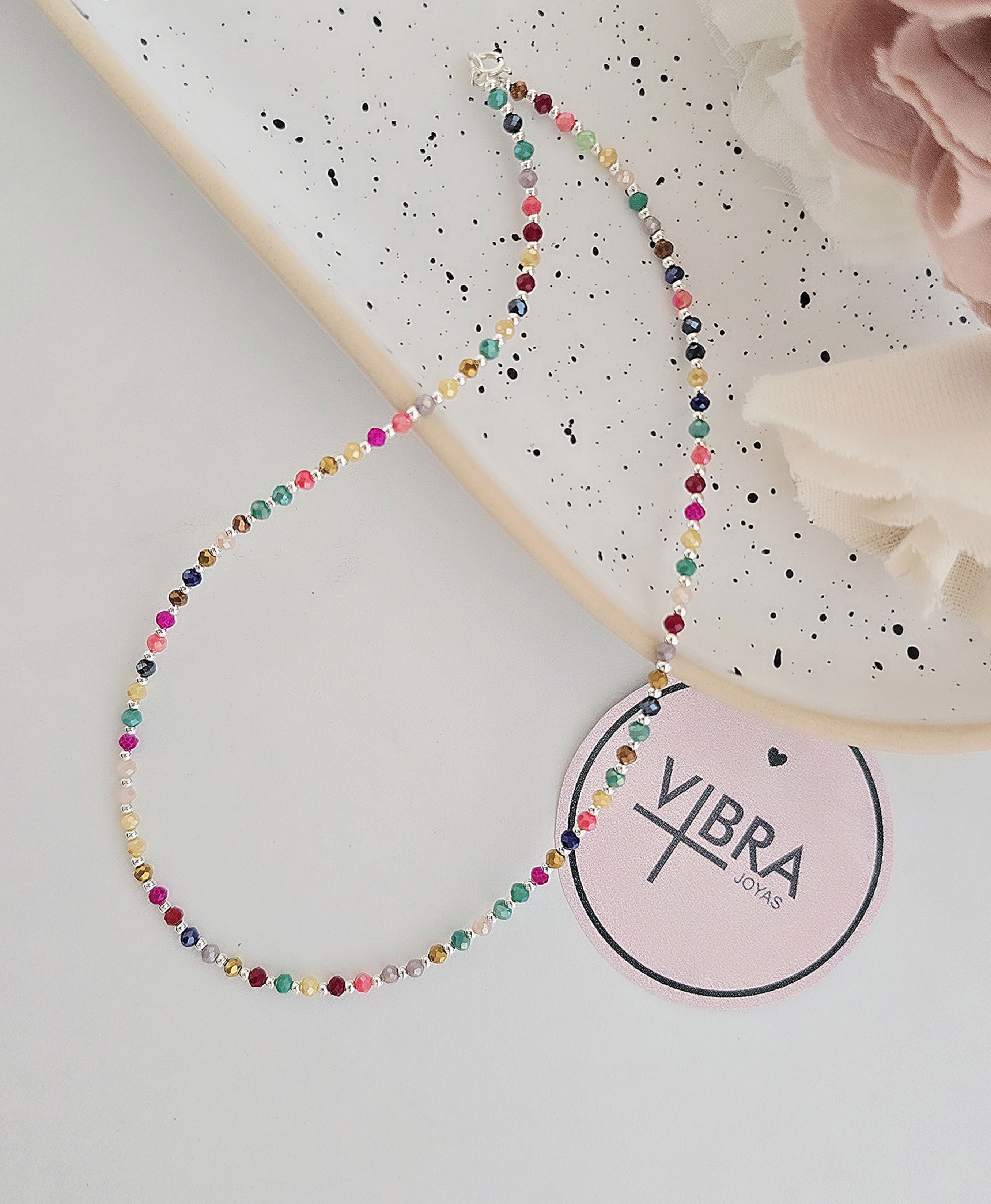 Un diseño delicado y lleno de frescura, confeccionado con cristales checos en tonos vibrantes que aportan alegría y estilo a cualquier look. Su formato corto tipo choker lo convierte en un accesorio versátil, y tiene un extensor de 5cm por si lo queres llevar mas largo.