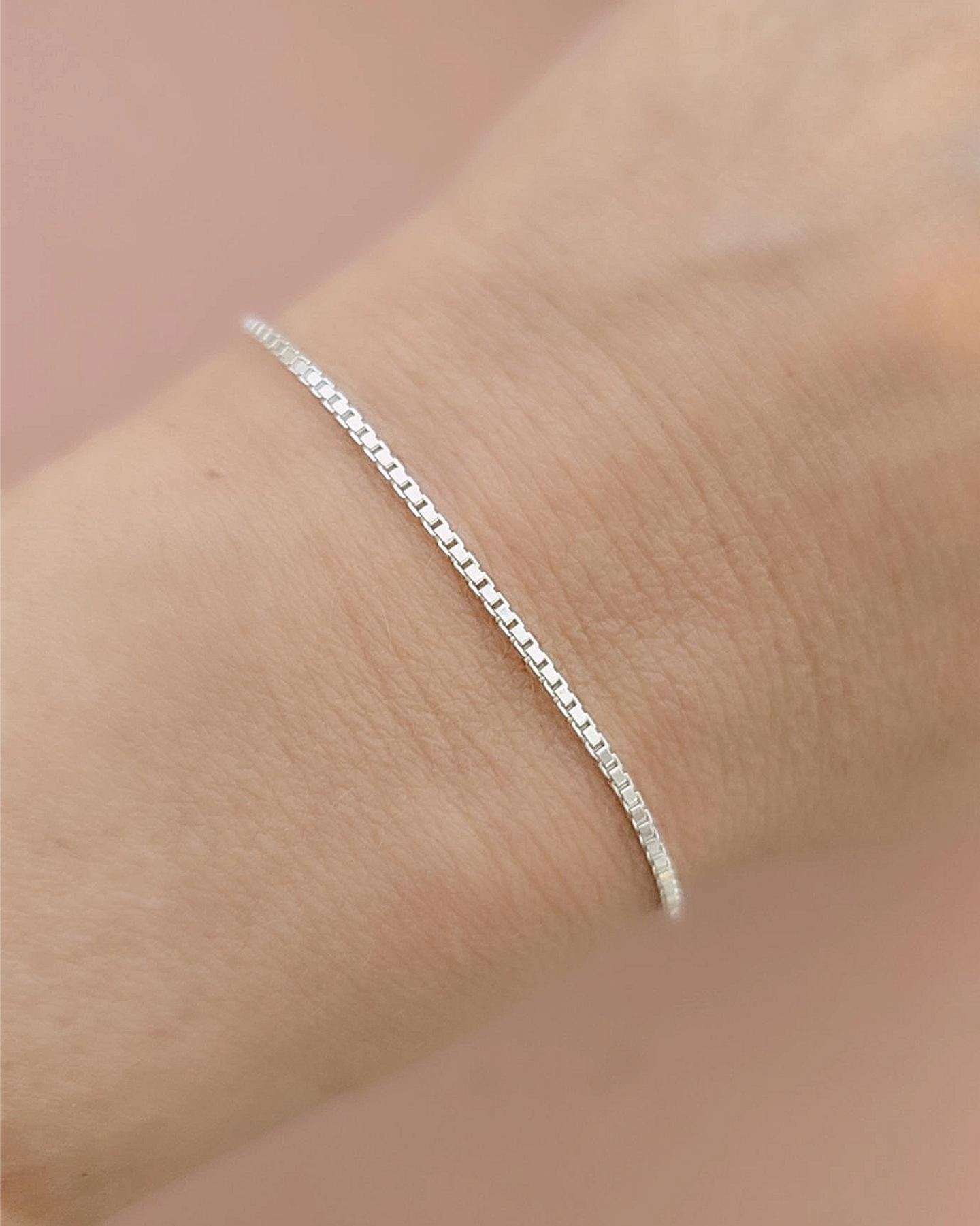 Clásica y versátil, esta pulsera de cadena box en Plata 925 es un básico que nunca pasa de moda. Su diseño minimalista la convierte en el complemento ideal para usar sola, en el día a día, o para combinar con otras pulseras y crear un estilo único y personalizado. Resistente, delicada y atemporal: una joya que siempre suma a tu colección.